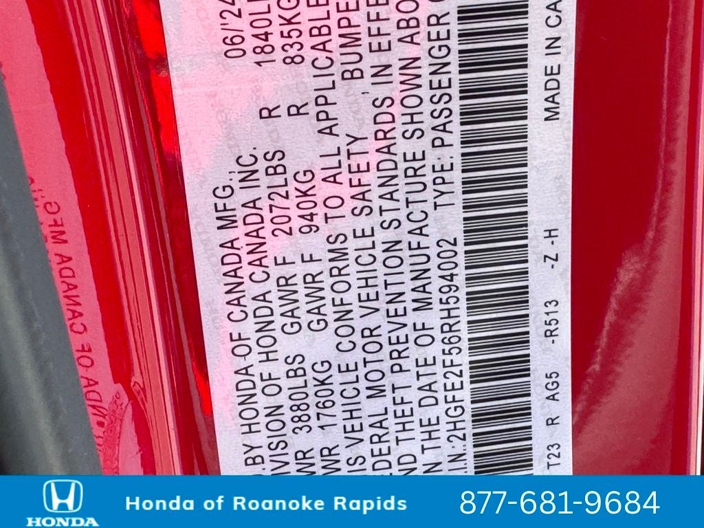 Rallye Red 2024 Honda Civic Sport 4D Sedan FWD 2.0L I4 DOHC 16V i-VTEC CVT