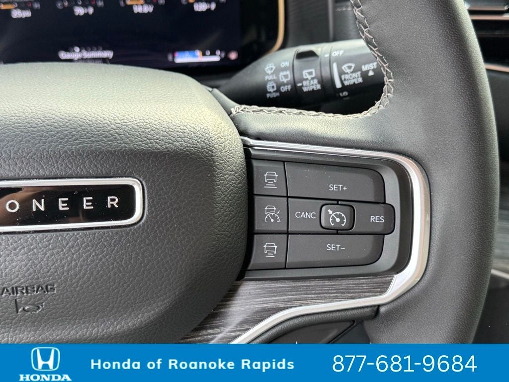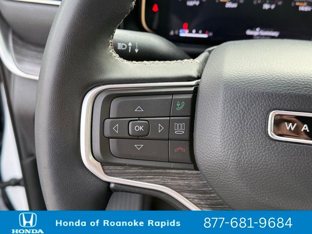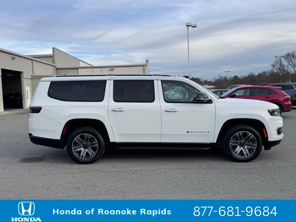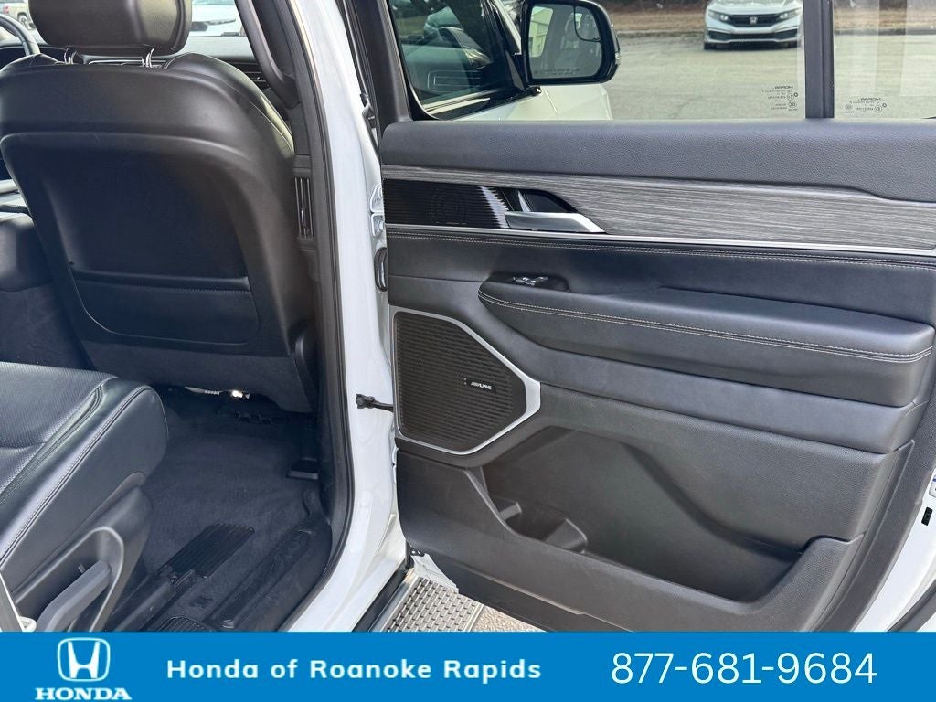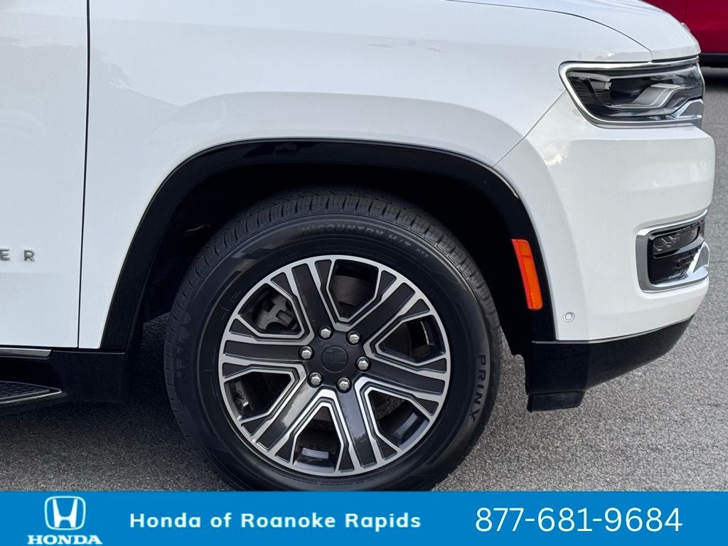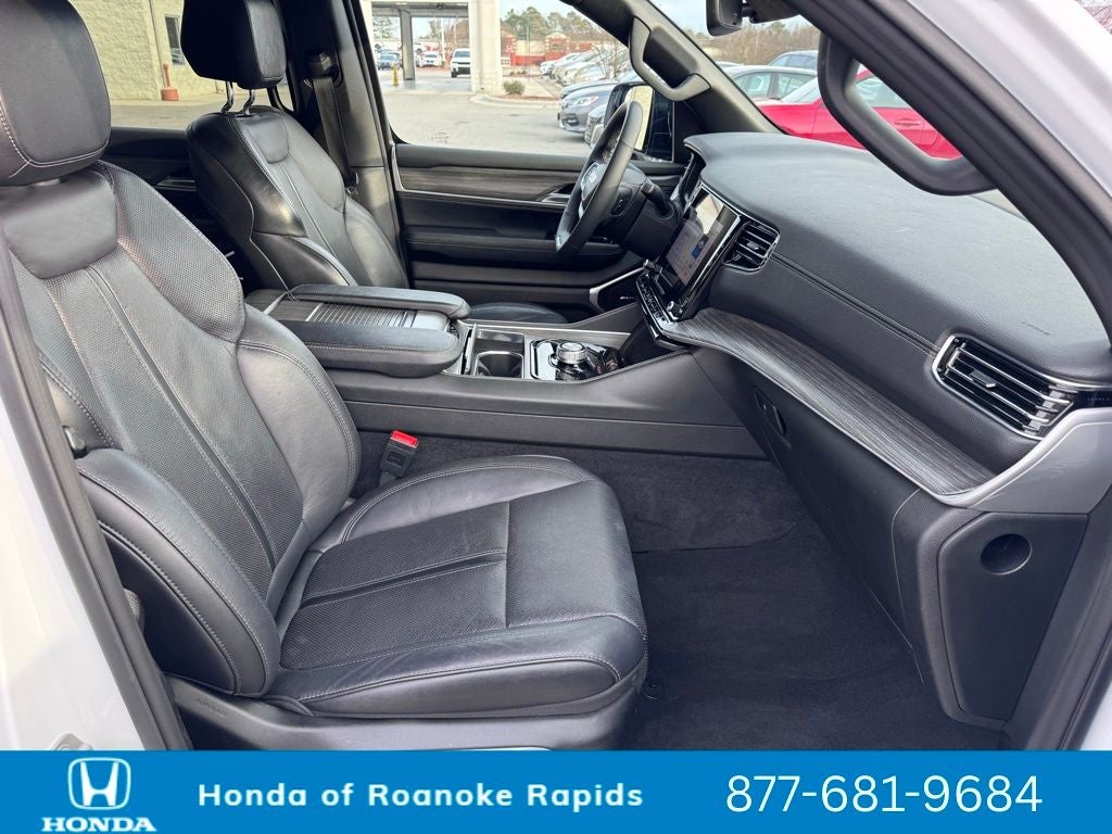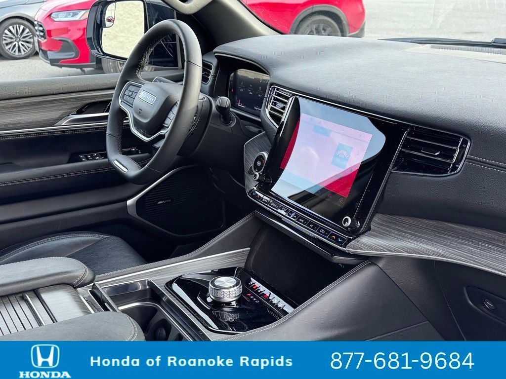 10 Speakers, 3.55 Rear Axle Ratio, 3rd row seats: bench, 4-Wheel Disc Brakes, ABS brakes, Adjustable pedals, Air Conditioning, Alloy wheels, AM/FM radio: SiriusXM with 360L, Anti-whiplash front head restraints, Apple CarPlay/Android Auto, Audio memory, Auto-dimming door mirrors, Auto-dimming Rear-View mirror, Auto-leveling suspension, Automatic temperature control, Brake assist, Bumpers: body-color, Compass, Delay-off headlights, Driver door bin, Driver vanity mirror, Driver's Seat Mounted Armrest, Dual front impact airbags, Dual front side impact airbags, Electronic Stability Control, Emergency communication system: Wagoneer Connect, Exterior Parking Camera Rear, Four wheel independent suspension, Front anti-roll bar, Front Bucket Seats, Front Center Armrest w/Storage, Front dual zone A/C, Front fog lights, Front reading lights, Fully automatic headlights, Garage door transmitter, Genuine wood console insert, Genuine wood dashboard insert, Genuine wood door panel insert, Heated door mirrors, Heated front seats, Heated steering wheel, Illuminated entry, Knee airbag, Leather Trimmed Bucket Seats, Low tire pressure warning, Memory seat, Navigation System, Normal Duty Suspension, Occupant sensing airbag, Outside temperature display, Overhead airbag, Overhead console, Panic alarm, Passenger door bin, Passenger seat mounted armrest, Passenger vanity mirror, Pedal memory, Power adjustable front head restraints, Power door mirrors, Power driver seat, Power Liftgate, Power passenger seat, Power steering, Power windows, Quick Order Package 25J, Radio data system, Radio: Uconnect 5 Nav w/10.1 Display, Rain sensing wipers, Rear air conditioning, Rear anti-roll bar, Rear reading lights, Rear seat center armrest, Rear window defroster, Rear window wiper, Reclining 3rd row seat, Remote keyless entry, Security system, Speed control, Speed-sensing steering, Speed-Sensitive Wipers, Split folding rear seat, Steering wheel memory, Steering wheel mounted audio controls, Tachometer, Telescoping steering wheel, Tilt steering wheel, Traction control, Trip computer, Turn signal indicator mirrors, Variably intermittent wipers, Ventilated front seats, Voltmeter, Wheels: 20 x 9.0 Premium 2 Aluminum.