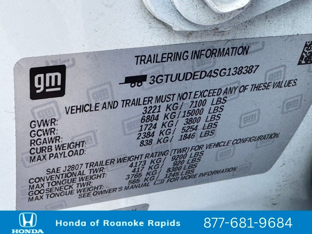 10-Speed Automatic, 4WD, Black Leather, 10-Way Power Driver Seat Adjuster w/Lumbar, 10-Way Power Passenger Seat Adjuster w/Lumbar, 120-Volt Bed Mounted Power Outlet, 120-Volt Interior Power Outlet, 170 Amp Alternator, 2 Charge/Data USB Ports, 2 Type-C Charge-Only Rear USB Ports, 3.23 Rear Axle Ratio, 4-Wheel Disc Brakes, 6 Speakers, 6-Speaker Audio System Feature, ABS brakes, Air Conditioning, Alloy wheels, AM/FM radio: SiriusXM with 360L, Apple CarPlay/Android Auto, Auto High-beam Headlights, Auto-dimming door mirrors, Auto-dimming Rear-View mirror, Auto-Locking Rear Differential, Automatic Emergency Braking, Automatic temperature control, Auxiliary External Transmission Oil Cooler, Brake assist, Buckle to Drive, Bumpers: chrome, Chrome Header & Chrome Grille Insert Bars, Color-Keyed Carpeting Floor Covering, Compass, Deep-Tinted Glass, Delay-off headlights, Driver door bin, Driver Memory, Driver vanity mirror, Dual front impact airbags, Dual front side impact airbags, Electric Rear-Window Defogger, Electronic Stability Control, Emergency communication system: OnStar, Following Distance Indicator, Forward Collision Alert, Front 40/20/40 Split-Bench Seat, Front anti-roll bar, Front Center Armrest w/Storage, Front dual zone A/C, Front fog lights, Front Frame-Mounted Black Recovery Hooks, Front Pedestrian Braking, Front Rain-Sensing Wipers, Front reading lights, Front wheel independent suspension, Fully automatic headlights, HD Rear Vision Camera, Heated door mirrors, Heated Driver & Front Outboard Passenger Seating, Heated front seats, Heated steering wheel, Hitch Guidance, Illuminated entry, Integrated Trailer Brake Controller, IntelliBeam Automatic High Beam On/Off, Keyless Open & Start, Lane Keep Assist w/Lane Departure Warning, LED Cargo Area Lighting, Low tire pressure warning, Manual Tilt-Wheel & Telescoping Steering Column, Memory seat, Navigation System, Occupant sensing airbag, OnStar Services Capable, Outside temperature display, Overhead airbag, Overhead console, Panic alarm, Passenger door bin, Passenger vanity mirror, Perf Leather-Appointed Front Outboard Seat Trim, Perimeter Lighting, Power Door Locks, Power door mirrors, Power driver seat, Power Front Passenger Windows w/Express Up/Down, Power Front Windows w/Driver Express Up/Down, Power passenger seat, Power Rear Windows w/Express Down, Power steering, Power windows, Preferred Equipment Group 4SA, Push Button Start, Radio data system, Radio: Premium GMC Infotainment Audio System, Rain sensing wipers, Rear reading lights, Rear seat center armrest, Rear step bumper, Rear Wheelhouse Liners, Rear window defroster, Remote keyless entry, Remote Vehicle Starter System, Security system, SiriusXM w/360L Trial Subscription, Speed control, Speed-sensing steering, Split folding rear seat, Standard Suspension Package, Steering Wheel Audio Controls, Steering wheel mounted audio controls, Tachometer, Telescoping steering wheel, Theft Deterrent System (Unauthorized Entry), Tilt steering wheel, Traction control, Trailering Package, Trip computer, Variably intermittent wipers, Voltmeter, Wheels: 18 x 8.5 6-Spoke Machined Aluminum, Wi-Fi Hotspot Capable, Wireless Apple CarPlay/Wireless Android Auto, 10-Speed Automatic, 4WD, Black Leather.